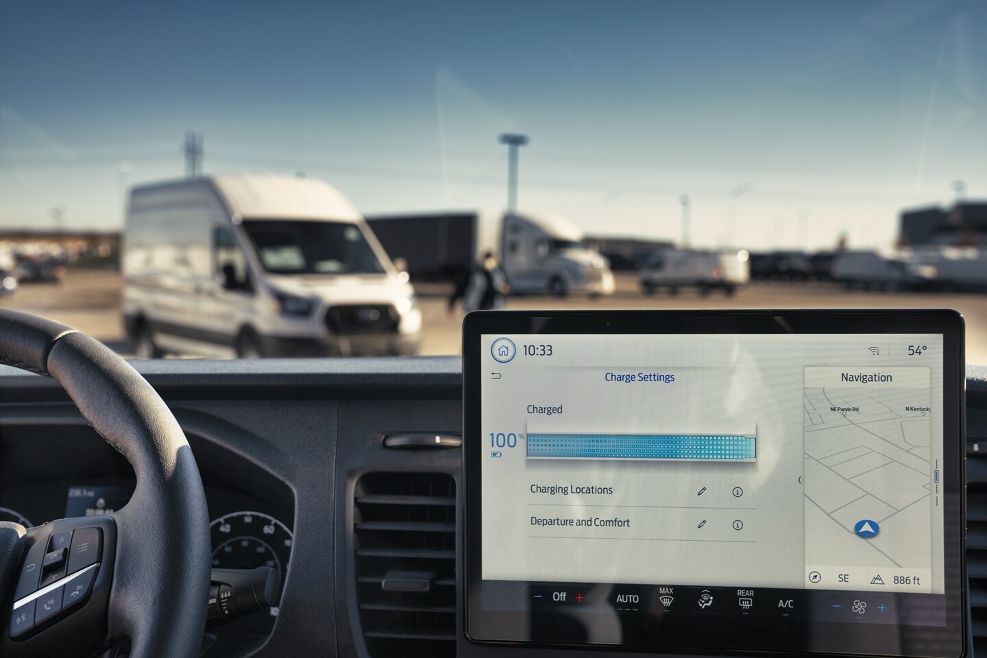 All-electric performance helps to take the 2023 Ford E-Transit-350 to the next level as a work-ready van. You'll find an available option to implement a 75 mph governed speed limit on the Chassis Cab and Cutaway. The available Pro Power Onboard will supply 2.4kW of power to keep your tools charged for the next job. Additional features include side-wind stabilization, hill start assist, and AdvanceTrac with roll stability control.