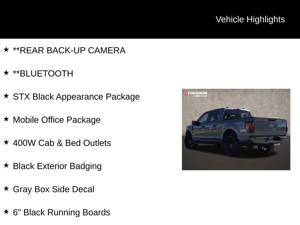 Elevate your driving experience with the 2025 Ford F-150 STX 4X4. This versatile truck is equipped with a host of premium features that cater to your needs, from the mobile office console to the 400W power outlets. With its impressive fuel efficiency, robust performance, and exceptional utility, the F-150 STX 4X4 is the ultimate work-ready companion.