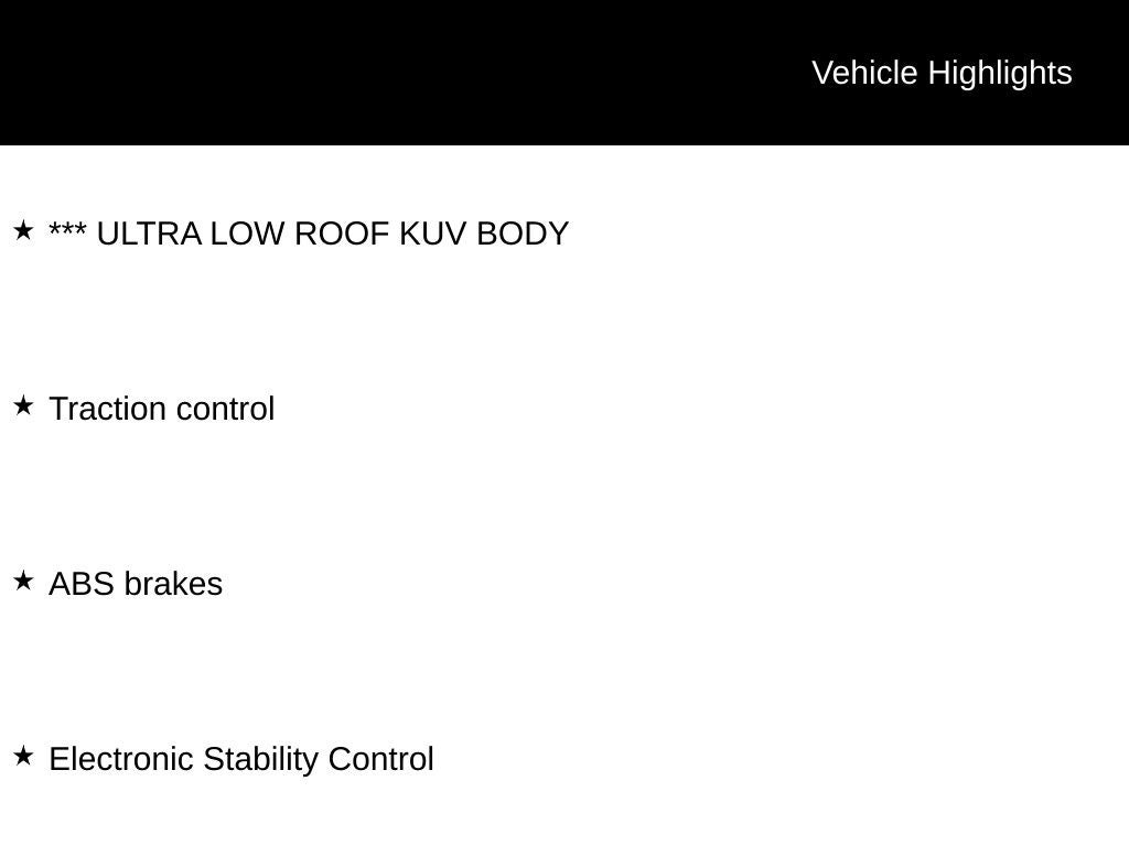 ABS brakes, Electronic Stability Control, Traction control, 2 Speakers, 4-Wheel Disc Brakes, 4.10 Axle Ratio, Air Conditioning, AM/FM radio, Driver door bin, Driver's Seat Mounted Armrest, Dual front impact airbags, Dual High Back Buckets, Front anti-roll bar, Front Bucket Seats, Front wheel independent suspension, Fully automatic headlights, Passenger door bin, Passenger seat mounted armrest, Power steering, Radio: AM/FM Stereo w/Clock Display & 2 Speakers, Tachometer, Telescoping steering wheel, Tilt steering wheel, Variably intermittent wipers, Vinyl Bucket Seats, Voltmeter, *** ULTRA LOW ROOF KUV BODY, ABS brakes, Electronic Stability Control, Traction control.