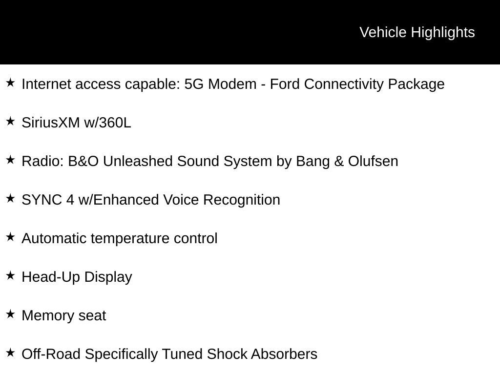 The Black Appearance Package adds a bold, aggressive stance, with features like ebony black fender vents, a gloss black grille, and 20-inch Ebony Black High Gloss wheels. Meanwhile, the Lariat Ultimate Package elevates your driving experience with a premium B&O sound system, a head-up display, and power-deployable running boards.