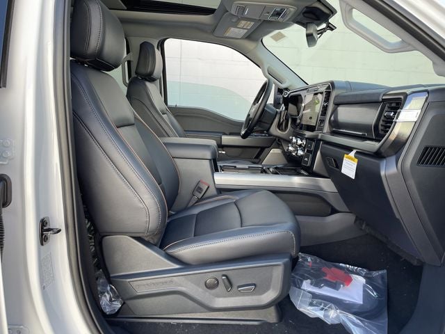 4WD, 190 Amp Alternator, 250 Amp Alternator, 4-Wheel Disc Brakes, 5th Wheel/Gooseneck Hitch Prep Package, 6 Ebony Black Angular Running Boards, 8 Speakers, ABS brakes, Adaptive Cruise Control with Stop-and-Go, Adjustable pedals, Air Conditioning, All-Weather Floor Mats, Alloy wheels, AM/FM radio: SiriusXM with 360L, Auto High-beam Headlights, Auto-dimming Rear-View mirror, Automatic High Beam, Automatic temperature control, Black Appearance Package, Black Painted Front Grille Surround, BLIS with Cross-Traffic Alert, Body Color Front and Rear Bumpers, Brake assist, Bumpers: chrome, Compass, Delay-off headlights, Driver door bin, Driver vanity mirror, Dual front impact airbags, Dual front side impact airbags, Ebony Black Painted Mirror Caps, Electronic Stability Control, Emergency communication system: SYNC 4 911 Assist, Flow-Through Console, Ford Connectivity Package (1-Year Included), Front ActiveX Trimmed 40/Console/40 Seats, Front and Rear Parking Sensors, Front anti-roll bar, Front Bucket Seats, Front Center Armrest, Front dual zone A/C, Front fog lights, Front reading lights, Front Splash Guards/Mud Flaps, Fully automatic headlights, FX4 Off-Road Package, Garage door transmitter, Gooseneck Hitch Kit, Heated door mirrors, Heated front seats, Heated rear seats, Heated steering wheel, Hill Descent Control, Illuminated entry, Internet access capable: 5G Modem - Ford Connectivity Package, Lane-Keeping System, Lariat Premium Package, LED Roof Clearance Lights, Low tire pressure warning, Memory seat, Navigation system: Connected Navigation, Off-Road Specifically Tuned Shock Absorbers, Order Code 618A, Outside temperature display, Overhead airbag, Overhead console, Panic alarm, Passenger door bin, Passenger vanity mirror, Pedal memory, Post-Collision Braking, Power door mirrors, Power driver seat, Power passenger seat, Power steering, Power windows, Power-Sliding Rear-Window with Defrost, Pre-Collision Assist, Privacy Glass, Pro Trailer Backup Assist, Pro Trailer Hitch Assist, Radio: B&O Sound System by Bang and Olufsen, Rain sensing wipers, Rear Parking Sensors, Rear reading lights, Rear seat center armrest, Rear Splash Guards/Mud Flaps, Rear step bumper, Rear window defroster, Remote keyless entry, Security system, SiriusXM with 360L, SiriusXM with 360L (3-Year Plan), Snow Plow Prep Package, Speed control, Split folding r
