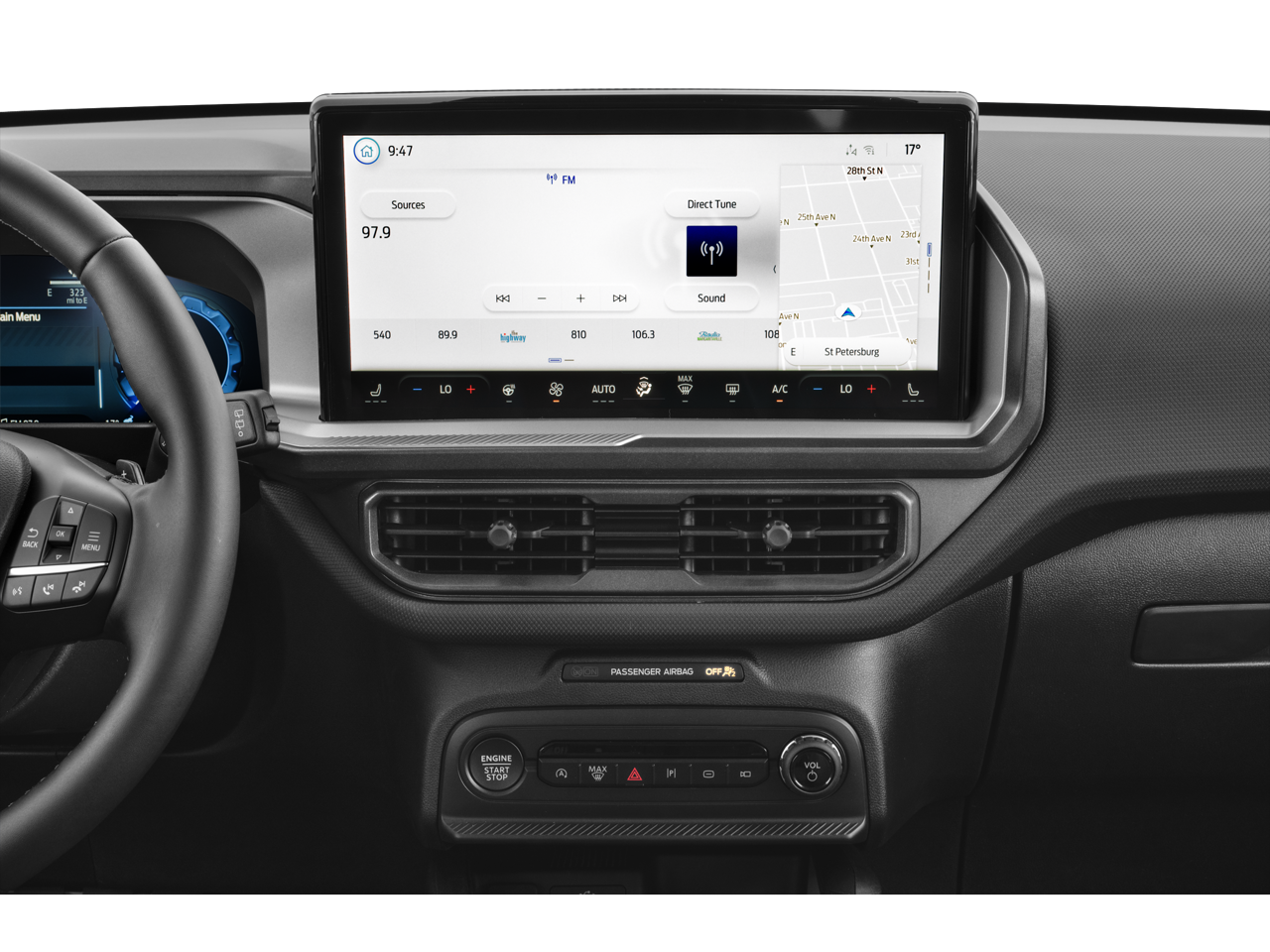 4-Wheel Disc Brakes, 6 Speakers, ABS brakes, Air Conditioning, Alloy wheels, AM/FM radio: SiriusXM with 360L, AM/FM Stereo, Apple CarPlay/Android Auto, Auto High-beam Headlights, Auto-dimming Rear-View mirror, Automatic temperature control, Brake assist, Compass, Delay-off headlights, Driver door bin, Driver vanity mirror, Dual front impact airbags, Dual front side impact airbags, Electronic Stability Control, Emergency communication system: SYNC 4 911 Assist, Equipment Group 400A Standard Package, Exterior Parking Camera Rear, Ford Connectivity Package (1-Year Included), Four wheel independent suspension, Front and Rear Floor Liners Without Carpet Mats, Front and Rear Splash Guards, Front anti-roll bar, Front Bucket Seats, Front Center Armrest, Front fog lights, Front reading lights, Fully automatic headlights, Heated door mirrors, Heated front seats, Heated steering wheel, Illuminated entry, Internet access capable: 5G Modem - Ford Connectivity Package, Knee airbag, Leather-Trimmed Heated Front Sport Contour Bucket Seats, Low tire pressure warning, Memory seat, Occupant sensing airbag, Outside temperature display, Overhead airbag, Overhead console, Panic alarm, Passenger door bin, Passenger vanity mirror, Power door mirrors, Power driver seat, Power passenger seat, Power steering, Power windows, Radio data system, Rear anti-roll bar, Rear reading lights, Rear seat center armrest, Rear window defroster, Rear window wiper, Remote keyless entry, Security system, SiriusXM with 360L, Speed control, Speed-sensing steering, Speed-Sensitive Wipers, Split folding rear seat, Steering wheel mounted audio controls, SYNC 4 with Enhanced Voice Recognition, Tachometer, Telescoping steering wheel, Tilt steering wheel, Traction control, Trip computer, Variably intermittent wipers, Wheels: 17 Matte Black-Painted Aluminum. Recent Arrival!