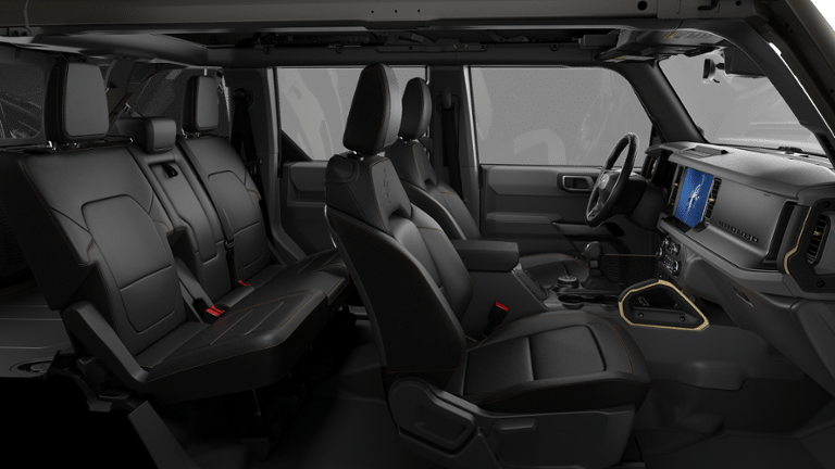 4-Wheel Disc Brakes, 7 Speakers, ABS brakes, Air Conditioning, Alloy wheels, AM/FM radio: SiriusXM with 360L, AM/FM Stereo, Auto High-beam Headlights, Auto-dimming Rear-View mirror, Brake assist, Compass, Delay-off headlights, Driver door bin, Driver vanity mirror, Dual front impact airbags, Dual front side impact airbags, Electronic Stability Control, Emergency communication system: 911 Assist, Exterior Parking Camera Rear, Ford Connectivity Package (1-Year Included), Front and Rear Floor Liners, Front anti-roll bar, Front Bucket Seats, Front Center Armrest, Front fog lights, Front reading lights, Front Row Top Panels and Door Storage Bags, Front Stabilizer Disconnect, Front wheel independent suspension, Fully automatic headlights, Hard Top Sound Deadening Headliner, Heated door mirrors, Heated front seats, High Clearance Suspension, Illuminated entry, Integrated roll-over protection, Leather Shift Knob, Leather-Trimmed/Vinyl Bucket Seats, Low tire pressure warning, Marine Grade Vinyl Heated Bucket Seats, Occupant sensing airbag, Outside temperature display, Overhead airbag, Overhead console, Painted Hard Top, Panic alarm, Passenger door bin, Passenger vanity mirror, Position-Sensitive Bilstein Shock Absorbers, Power door mirrors, Power steering, Power windows, Radio data system, Raptor-Style Running Board, Rear-Window Defroster and Washer, Remote keyless entry, Sasquatch Package, Security system, SiriusXM with 360L, Speed control, Split folding rear seat, Steering wheel mounted audio controls, SYNC 4, Tachometer, Telescoping steering wheel, Tilt steering wheel, Traction control, Trip computer, Upgraded Carpet Floor Mats, Variably intermittent wipers, Voltmeter, Wheels: 17 Black High Gloss-Painted Aluminum, Wheels: 17 Carbonized Gray-Painted Aluminum, Wheels: 17 Matte Black Alloy.