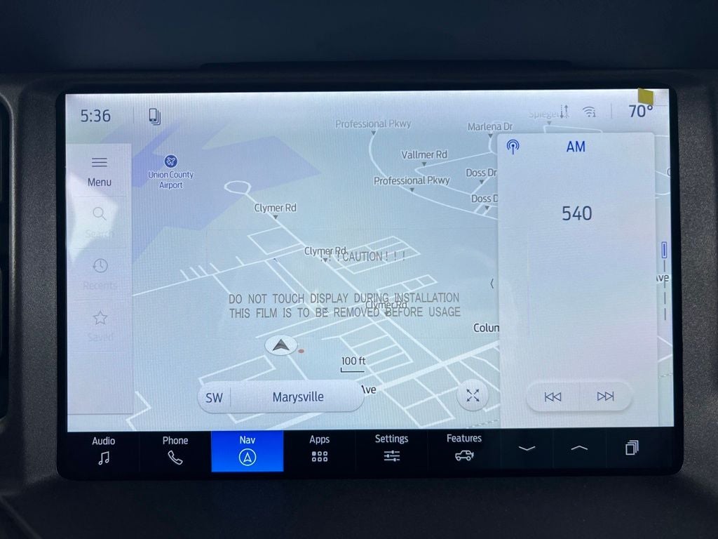 4-Wheel Disc Brakes, 7 Speakers, ABS brakes, Air Conditioning, Alloy wheels, AM/FM radio: SiriusXM with 360L, AM/FM Stereo, Auto High-beam Headlights, Auto-dimming Rear-View mirror, Brake assist, Compass, Delay-off headlights, Driver door bin, Driver vanity mirror, Dual front impact airbags, Dual front side impact airbags, Electronic Stability Control, Emergency communication system: 911 Assist, Exterior Parking Camera Rear, Ford Connectivity Package (1-Year Included), Front anti-roll bar, Front Bucket Seats, Front Center Armrest, Front fog lights, Front reading lights, Front Stabilizer Disconnect, Front wheel independent suspension, Fully automatic headlights, Hard Top Sound Deadening Headliner, Heated door mirrors, Heated front seats, High Clearance Suspension, Illuminated entry, Integrated roll-over protection, Leather Shift Knob, Low tire pressure warning, Marine Grade Vinyl Heated Bucket Seats, Occupant sensing airbag, Outside temperature display, Overhead airbag, Overhead console, Painted Hard Top, Panic alarm, Passenger door bin, Passenger vanity mirror, Position-Sensitive Bilstein Shock Absorbers, Power door mirrors, Power steering, Power windows, Radio data system, Rear-Window Defroster and Washer, Remote keyless entry, Sasquatch Package, Security system, SiriusXM with 360L, Speed control, Split folding rear seat, Steering wheel mounted audio controls, SYNC 4, Tachometer, Telescoping steering wheel, Tilt steering wheel, Traction control, Trip computer, Variably intermittent wipers, Voltmeter, Wheels: 17 Carbonized Gray-Painted Aluminum.