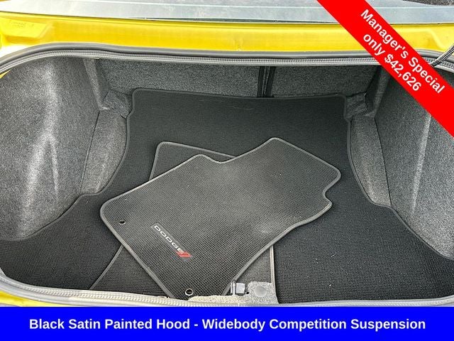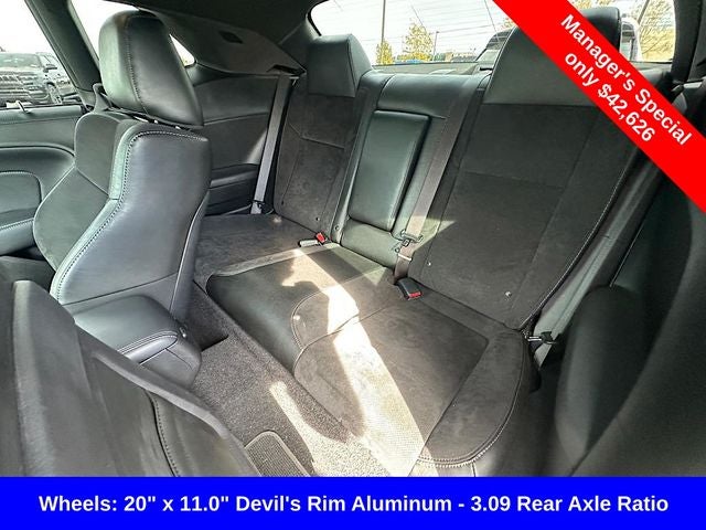3.09 Rear Axle Ratio, 392 Fender Decal, Adaptive Damping Suspension, Black Satin Painted Hood, Brembo 6-Pot Fixed Front Caliper Brakes, Door Trim Panel w/Ambient Lighting, Flat-Bottom Steering Wheel, Functional Hood Scoop, Gloss Black I/P Cluster Trim Rings, GPS Navigation, Heated Steering Wheel, Houndstooth Cloth Performance Seats, Illuminated Air-Catcher Headlamps, Mopar Bright Door Sills, MOPAR Cold Air Intake System, Mopar Interior Appearance Group, MOPAR Premium Floor Mats w/Logo, Performance Shift Indicator, Plus Package, Power Tilt/Telescope Steering Column, Premium-Stitched Dash Panel, Quick Order Package 24N R/T Scat Pack Widebody, Radio/Driver Seat/Mirrors Memory, Satin Wrap Roof/Decklid, T/A Bodyside Graphic, T/A Package, T/A Spoiler Decal, Trunk Mat w/Logo, Wheels: 20 x 11.0 Devil's Rim Aluminum, White Face Instrument Cluster, Widebody Competition Suspension, Widebody Fender Flares.