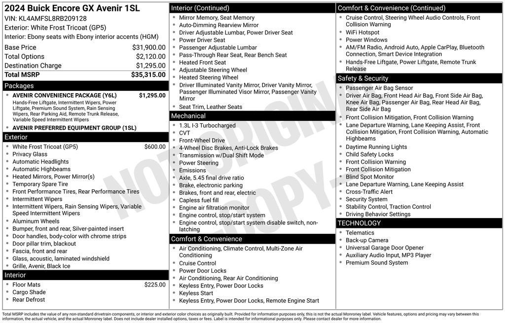The striking Off-white exterior, complemented by the Avenir-exclusive 19-inch Pearl Nickel aluminum wheels, gives this Encore GX a refined and sophisticated appearance that is sure to turn heads. The hands-free power liftgate and all-weather floor liners add both convenience and practicality to your everyday driving experience.