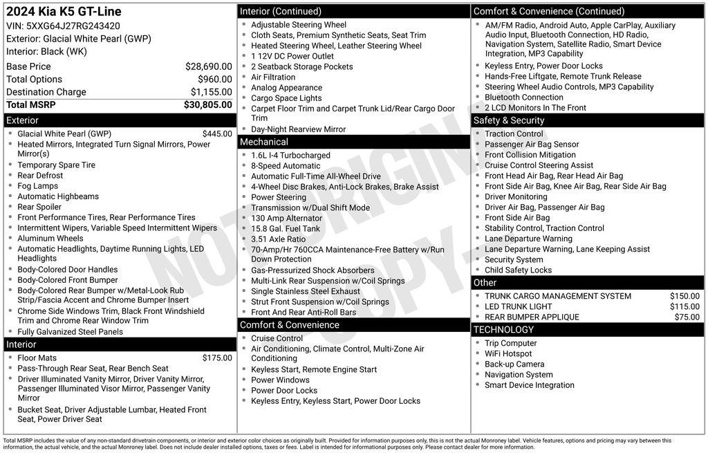 The K5 GT-Line also boasts a comprehensive suite of advanced safety and technology features, including Apple CarPlay & Android Auto, a Navigation System, and a Rear Bumper Applique. These cutting-edge systems work together to keep you connected, entertained, and protected on the road.