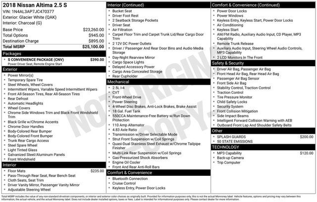 16 x 7.0 Steel w/Full Covers Wheels, 4-Wheel Disc Brakes, 6 Speakers, 6-Way Power Driver's Seat, ABS brakes, Air Conditioning, AM/FM radio, AM/FM/CD/MP3 Audio System, Brake assist, Bumpers: body-color, CD player, Cloth Seat Trim, Delay-off headlights, Driver door bin, Driver vanity mirror, Dual front impact airbags, Dual front side impact airbags, Electronic Stability Control, Floor Mats Plus Trunk Mat (5-Piece Carpeted), Four wheel independent suspension, Front anti-roll bar, Front Bucket Seats, Front Center Armrest w/Storage, Front reading lights, Fully automatic headlights, Illuminated entry, Low tire pressure warning, Occupant sensing airbag, Outside temperature display, Overhead airbag, Overhead console, Panic alarm, Passenger door bin, Passenger vanity mirror, Power door mirrors, Power steering, Power windows, Radio data system, Rear anti-roll bar, Rear reading lights, Rear seat center armrest, Rear USB Port, Rear window defroster, Remote keyless entry, S Convenience Package, Security system, Speed control, Speed-sensing steering, Splash Guards, Split folding rear seat, Steering wheel mounted audio controls, Tachometer, Telescoping steering wheel, Tilt steering wheel, Traction control, Trip computer, Variably intermittent wipers. 2018 Nissan Altima