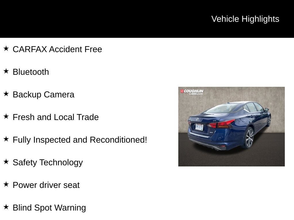 CVT with Xtronic, 19 Alloy Wheels, 4-Wheel Disc Brakes, 6 Speakers, ABS brakes, Air Conditioning, Alloy wheels, AM/FM radio: SiriusXM, Auto High-beam Headlights, Blind Spot Warning, Body-Colored Splash Guards, Brake assist, Bumpers: body-color, Chrome Bumper Protector, Delay-off headlights, Driver door bin, Driver vanity mirror, Dual front impact airbags, Dual front side impact airbags, Electronic Stability Control, Four wheel independent suspension, Front anti-roll bar, Front Bucket Seats, Front Center Armrest, Front reading lights, Front Sport Bucket Seats, Fully automatic headlights, Illuminated entry, Knee airbag, Leather Shift Knob, Low tire pressure warning, NissanConnect featuring Apple CarPlay and Android Auto, Occupant sensing airbag, Outside temperature display, Overhead airbag, Overhead console, Panic alarm, Passenger door bin, Passenger vanity mirror, Power door mirrors, Power driver seat, Power steering, Power windows, Radio data system, Radio: AM/FM Audio System, Rear anti-roll bar, Rear Parking Sensors, Rear reading lights, Rear seat center armrest, Rear side impact airbag, Rear window defroster, Remote keyless entry, Security system, Speed control, Speed-sensing steering, Speed-Sensitive Wipers, Split folding rear seat, Sport Seat Trim, Sport steering wheel, SR Floor Mats/Trunk Mat/Hideaway Nets, Steering wheel mounted audio controls, Tachometer, Telescoping steering wheel, Tilt steering wheel, Traction control, Trip computer, and Variably intermittent wipers.