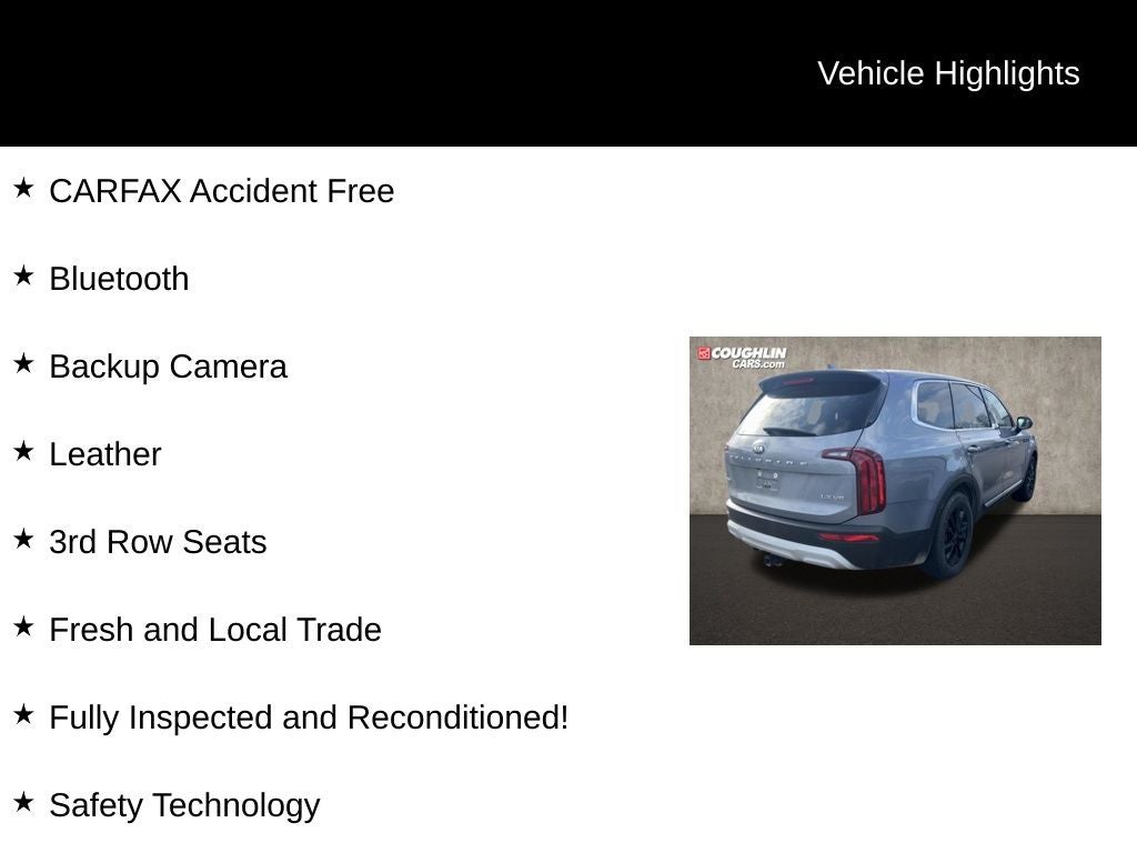 3.648 Axle Ratio, 3rd row seats: split-bench, 4-Wheel Disc Brakes, 6 Speakers, ABS brakes, Air Conditioning, Alloy wheels, AM/FM radio: SiriusXM, Apple CarPlay & Android Auto, Brake assist, Bumpers: body-color, Carpeted Floor Mats, Delay-off headlights, Driver door bin, Driver vanity mirror, Dual front impact airbags, Dual front side impact airbags, Electronic Stability Control, Emergency communication system: 911 Connect, Four wheel independent suspension, Front anti-roll bar, Front Bucket Seats, Front Center Armrest, Front reading lights, Fully automatic headlights, Heated door mirrors, Illuminated entry, Knee airbag, Leather steering wheel, Low tire pressure warning, Occupant sensing airbag, Outside temperature display, Overhead airbag, Overhead console, Panic alarm, Passenger door bin, Passenger vanity mirror, Power door mirrors, Power steering, Power windows, Radio data system, Radio: AM/FM/SIRIUS Display Audio, Rear air conditioning, Rear anti-roll bar, Rear reading lights, Rear seat center armrest, Rear window defroster, Rear window wiper, Reclining 3rd row seat, Remote keyless entry, Security system, Smart Key w/ Push Button and Remote Start, SOFINO Leathertte Seat Trim, Speed control, Speed-sensing steering, Split folding rear seat, Spoiler, Steering wheel mounted audio controls, Tachometer, Telescoping steering wheel, Tilt steering wheel, Traction control, Trip computer, Turn signal indicator mirrors, Variably intermittent wipers, and Wheels: 7.5 x 18 Painted Finish Alloy.