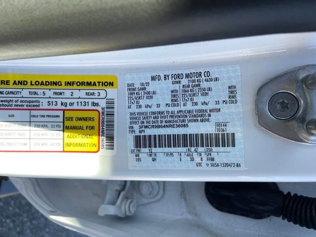 360 Degree Camera, Lane Departure Warning, Blind Spot Monitoring, Adaptive Cruise Control, Backup Camera, Bluetooth®, Navigation, Remote Start, Power Windows, Cruise Control, Heated Seats, Apple Car Play, Satelite Radio, Android Auto, Alloy Wheels, Chrome Wheels, Premium Wheels, Rear Cross Traffic Alert, Convenience Package, Equipment Group 200A, Ford Co-Pilot360 Assist+, Fully automatic headlights, Heated Front Bucket Seats, Intelligent Adaptive Cruise Control w/Stop & Go, Rear Parking Sensors, Universal Garage Door Opener (UGDO), Voice-Activated Touchscreen Navigation System, Wireless Charging Pad.