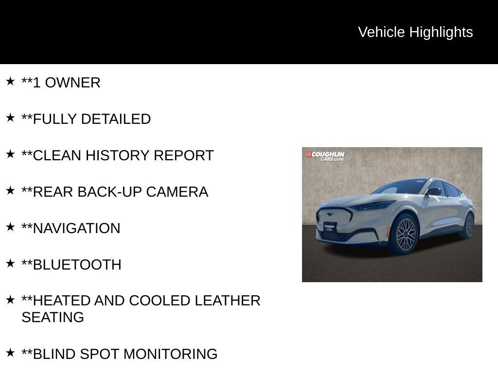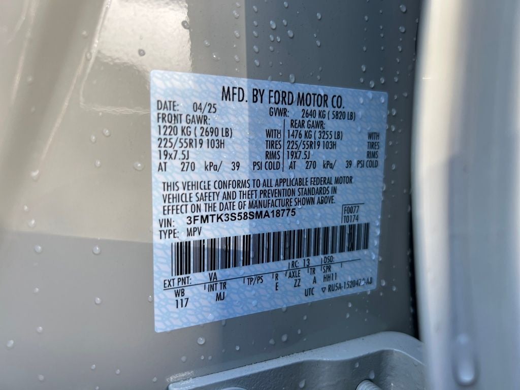 10 Speakers, 4-Wheel Disc Brakes, ABS brakes, Air Conditioning, Alloy wheels, AM/FM radio: SiriusXM with 360L, Apple CarPlay/Android Auto, Auto High-beam Headlights, Auto-dimming Rear-View mirror, Automatic temperature control, Brake assist, Bumpers: body-color, Compass, Delay-off headlights, Driver door bin, Driver vanity mirror, Dual front impact airbags, Dual front side impact airbags, Electronic Stability Control, Emergency communication system: 911 Assist, Equipment Group 300A Standard Package, Exterior Parking Camera Rear, Four wheel independent suspension, Front anti-roll bar, Front Bucket Seats, Front Center Armrest, Front dual zone A/C, Front License Plate Bracket, Front reading lights, Fully automatic headlights, Garage door transmitter, Heated door mirrors, Heated front seats, Heated steering wheel, Heated/Ventilated Perforated ActiveX Bucket Seats, Illuminated entry, Internet access capable: FordPass Connect, Knee airbag, Low tire pressure warning, Memory seat, Mobile Power Cord (120V/240V), Navigation system: Connected Navigation, Occupant sensing airbag, Outside temperature display, Overhead airbag, Overhead console, Panic alarm, Passenger door bin, Passenger vanity mirror, Power door mirrors, Power driver seat, Power Liftgate, Power passenger seat, Power steering, Power windows, Radio data system, Radio: B&O Sound System by Bang & Olufsen, Rain sensing wipers, Rear anti-roll bar, Rear seat center armrest, Rear side impact airbag, Rear window defroster, Rear window wiper, Remote keyless entry, Security system, SiriusXM w/360L, Speed control, Speed-sensing steering, Speed-Sensitive Wipers, Split folding rear seat, Spoiler, Steering wheel mounted audio controls, SYNC 4A w/Enhanced Voice Recognition, Telescoping steering wheel, Tilt steering wheel, Traction control, Trip computer, Turn signal indicator mirrors, Variably intermittent wipers, Ventilated front seats, Wheels: 19 Bright Machined-Face Aluminum.